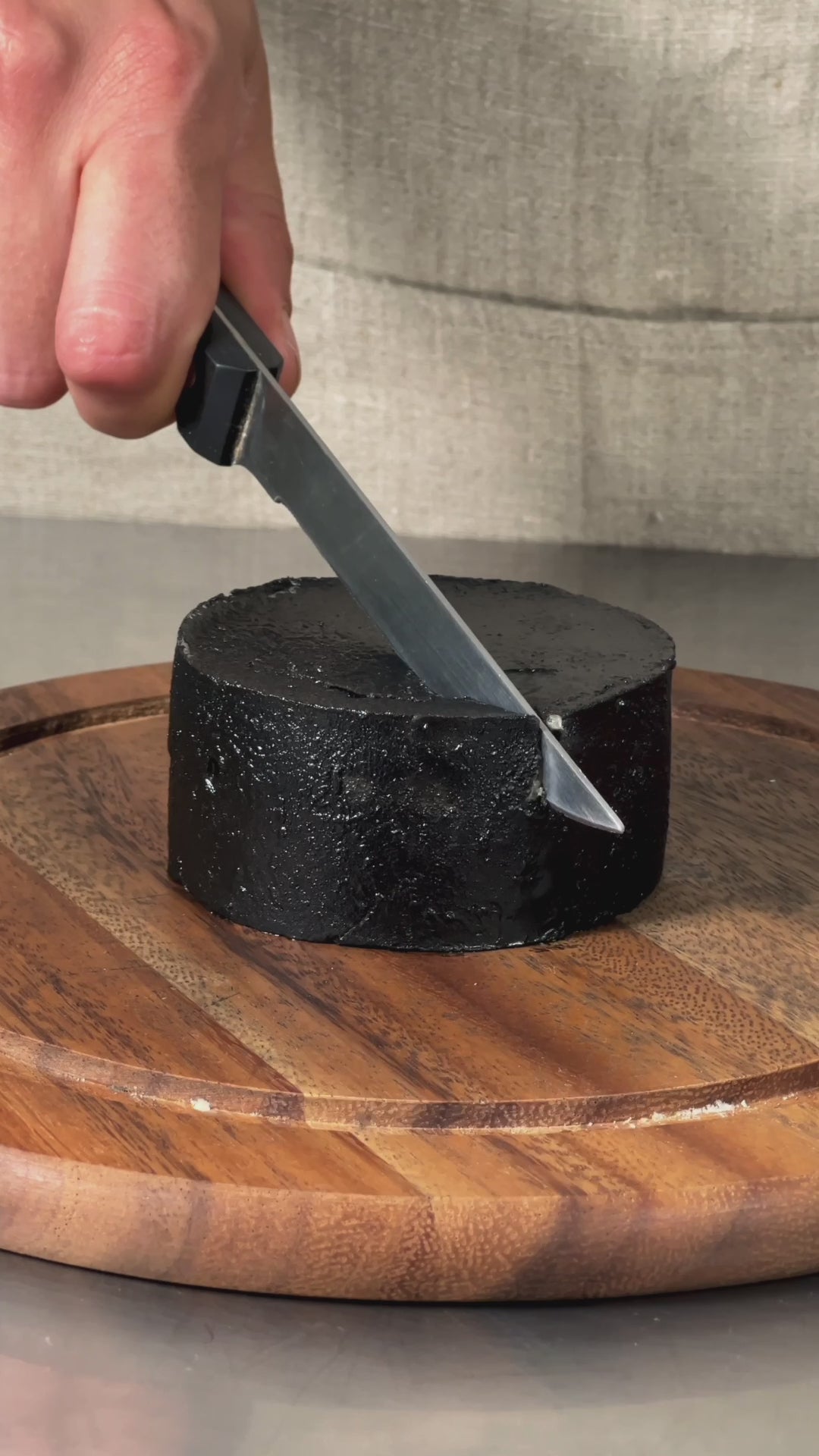 La crosta al carbone vegetale racchiude e protegge un cuore intenso al paté di tartufo nero, sprigionando profumi profondi e persistenti ad ogni taglio.